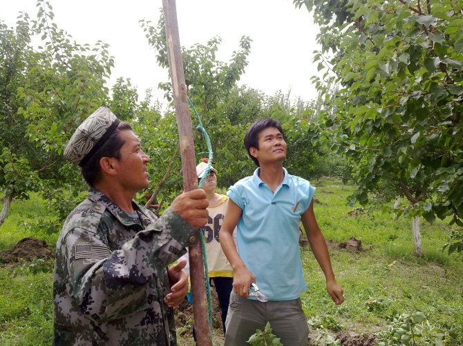 梁呈浩同志(右一)在麦盖提县志愿服务期间深入乡村开展义务支农