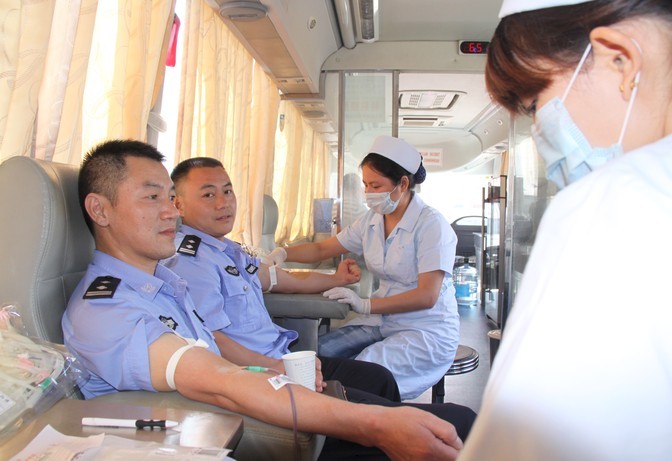 上午九点,万州区中心血站的两辆流动采血车刚一停稳,前来献血的民警职工就排成了长队。在血站工作人员的指引下,民警职工们按规定认真填写申请表、参加体检和抽血等。在献血队伍中,有的是刚参加工作的新民警,他们这是第一次参加献血;有的坚持每年都参加献血。民警向东,2000年参加工作,每年他都会主动参加献血,献血记录本上共记录了他13次的献血经历,献血已达4000毫升。他时常对大家说:我的工龄和我的“血龄”一样,只要身体健康,我一定会坚持下去。民警谢平,1997年参加工作,如今的他个人献血已15次,共达5000亳升,他已成了大家公认的“献血王”。这次,谢平因为刚参加过献血,他只能活跃在献血的队伍中,充当义务宣传员,介绍献血的意义、献血对身体的好处以及相关流程等。