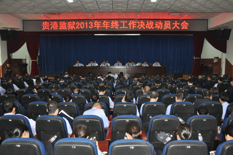 10月23日上午,贵港监狱在监管指挥中心一楼会议室召开2013年年终工作决战动员大会,黄德华监狱长对今年最后时段的工作进行部署,号召全监警察职工继续保持高昂的斗志,进一步强化措施,狠抓落实,全面完成全年的工作任务。