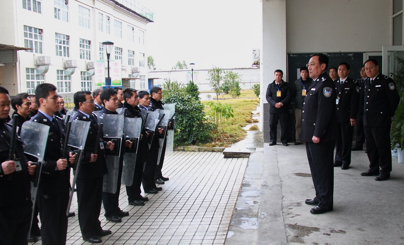从监区办公室出来后,赵厅长对监狱长李明乾提出了一个很实在的检查要求:“我们临时出个题目,就说现在三监区车间发生了罪犯骚乱,看一下你们的应急处置情况”。接到“考题”,李监狱长便举起对讲机向监狱总控室值班民警发出命令:“总控、总控,我是001,三监区车间发生罪犯骚乱,现在命令你们立即启动应急预案”“明白,我们立即启动预案”。“呜---------”警报汽笛随即响起,在监狱四周激越震荡。1分钟后,各监区当班民警迅速组织罪犯从车间劳动现场出来,到指定地点集合监管;5分钟后,监狱特警队20余人携带防爆装备冲锋到达事发现场严密防控;同时,监狱大门外各机关科室警察已经集合待命,驻监武警部队也已到达预案位置进行防控;15分钟后,监狱长发出指令演练结束,各监区对罪犯进行讲评,组织罪犯返回车间继续劳动。