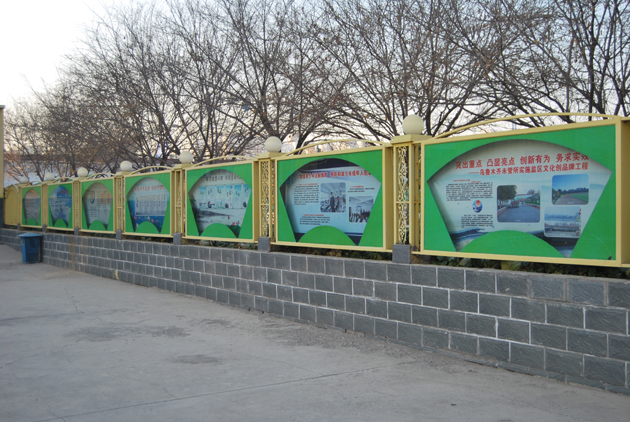 一个文化墙:用喷漆画将极富教育意义的图案喷绘在大墙上。整个创作图案以“扬帆起航”开篇,以“放飞梦想”压轴,用绵延起伏的天山、瀚海阑干的沙漠、风力发电作背景,将自由自在的牛、羊、大雁、骆驼,绿草地上的毡房、栅栏、牧区人家置于背景之中,给人以美的享受,展现了家乡之大美。