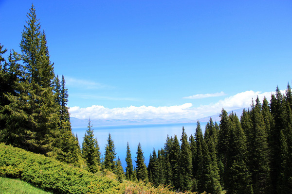 西望一谷,谷口有山,松林参天,俯视平湖。高寒极矣,常云环雾绕。雾气浓密,拂入湖面,平波生烟,翻腾若海,而远眺松树头,雾皆源于彼,宛如白瀑。古至伊犁,必经果子沟。此地山峦雄壮,谷壑纵深,将之谷底,始知湖居山巅。此天堑原为闭塞,昔蒙古成吉思汗遣马军西征,于此处劈山开石,修建栈道,始通门户。元邱道长言“金山东畔阴山西,千岩万壑横深溪。溪边乱石当道卧,古今不许通轮蹄。前年军兴二太子,修道架桥彻水溪。今年吾道欲西行,车马喧阗复经此。”又“银山铁壁千马重,争头竞角夸清雄。日出下观沧海近,月明上与天河通。”