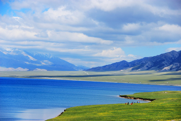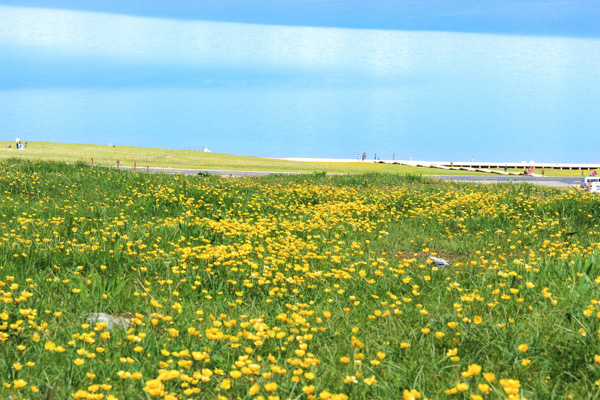 湖畔层草起伏,春来时,群芳灿烂。极尽色彩,尤以红色夺目,花边嵌于天际,得睹极难。夏至,鞑人于此聚会,其时牛羊马数以万计,奔腾绿海中,点点如浪花,滴滴似珠贝。