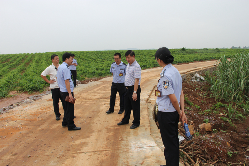 在原一、五监区,检查组实地查看纳入地方政府土地整治项目的进度。2014年初,监狱配合鹿寨县人民政府把监狱原一监区、五监区部分土地纳入地方政府土地整治范围,由鹿寨县人民政府负责资金投入,招投标,统一安排施工。中标单位在接到中标通知书后,工作主动,按开工令的时间要求于2014年3月15日进场组织施工。由于项目组织合理,项目所涉各方积极配合,目前已完成项目总工程量的80%,预计项目在年内能全部完工。