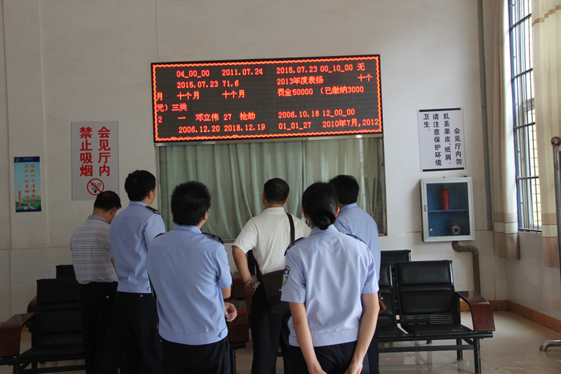 在监狱会见室,检查组查看了监狱用于狱务公开的电子大屏幕。目前电子大屏幕已安装完成,现处于调试阶段,预计于9月30日前可以正式启用。可按规定在会见室狱务公开栏及时公布减刑、假释、暂予监外执行案件的评审结果等狱务公开内容。