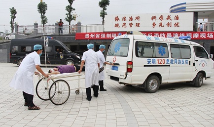 此次演练以假想暴徒在强制隔离戒毒所会见室门口砍杀无辜群众及袭警为背景,重点对民警单警装备使用、单兵擒拿、分组合围、解救人质、伤员救护、消防灭火、所内管控、多警联动等科目进行实战演练。演练中,安顺强制隔离戒毒所与安顺市公安局西秀分局、市急救中心、消防大队等多部门联合作战,在应急指挥中心的统一指挥下,迅速、有序地完成了全部演练科目,达到了预期效果。