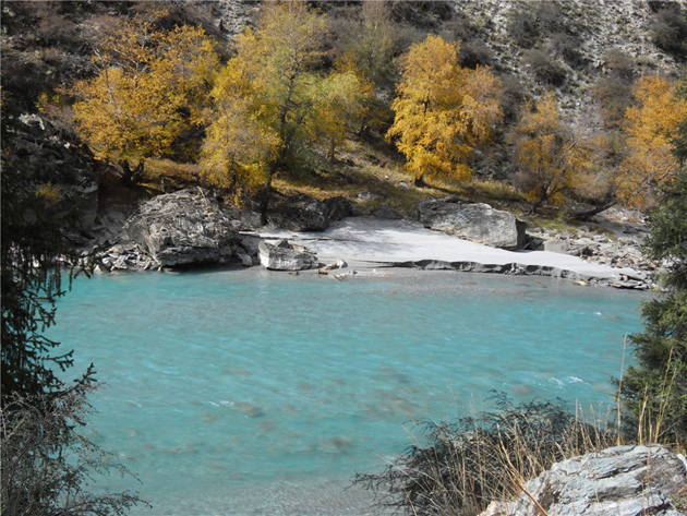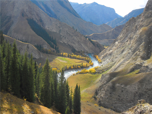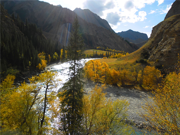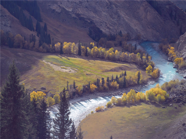 在南天山深处,阔克苏河像一位腼腆的少女,始终不肯将笼罩在脸上的面纱揭去。直到有人愿意虔诚地步行数十公里、涤去满身的尘埃和噪杂来到她身旁时,她才娇羞地将自己可人的容颜展示在旁人面前。当然,盛夏时节你可能遇到她狂暴、强势的英气和霸道;寒冬时分只能遭遇她冷如冰霜、不可欺近的高傲态度;唯有在金风吹拂的温和日子,她才像温文尔雅的淑女,静谧安宁的脸却又掩藏不住怦动火热的心。