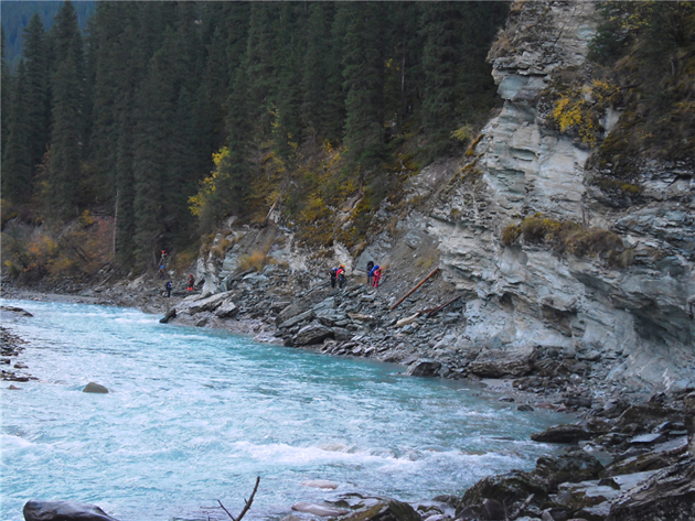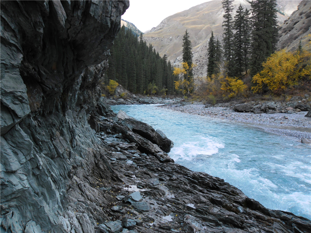 阔克苏河发源于天山分水岭北侧,自东向西后又垂直折向北流,全程奔涌在狭窄的山谷,将整个山脉切出一条深深的口子。河水里翻动着青蓝色的浪花,将透亮如玉的石英石拍打的异常光滑;河床底部散布着各式各样的卵石,有白色的、有青色的、有红色的,静静的躺在清澈的溪水。