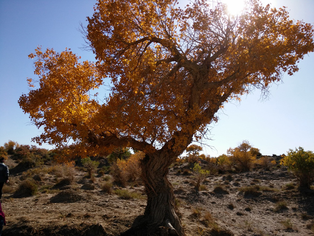 走在新疆的柏油路上,感觉路很长,可却让人走的很踏实,我喜欢沿路两旁的风景,有城市、有村庄、有青杨、有花草。记忆犹新的还是那突兀而又神秘的胡杨,我喜欢胡杨,胡杨一直是人们心中坚毅不倒的象征,被维吾尔族人誉为英雄树。它的精神被多少边塞诗人写进诗词,秋天的胡杨更是将储备了一年的激情在秋季一并迸发出来,散发出精美绝伦的金色,每一片叶脉都盛开暖意、每一个枝桠都挂满太阳,那是一种让人震撼的美,更是沙漠最美的颜色,忠贞不渝的胡杨也为这个一望无际的戈壁风景增添了一丝士气。