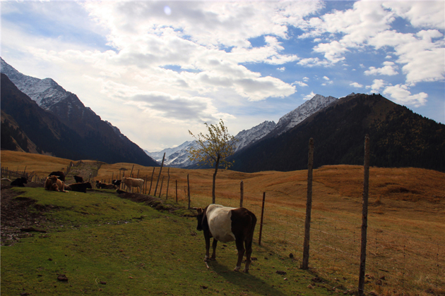 宽广的草地已经被温暖的阳光晒得金黄透亮,洁白的毡房伏在上面,烟囱里飘出淡蓝色的炊烟,一切都显得那么美好。牛、羊、马、骆驼等牲畜在这里吃着中草药,饮着矿泉水,呼吸着洁净的空气,踏着金银大道享受着高贵的生活。