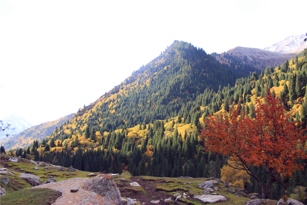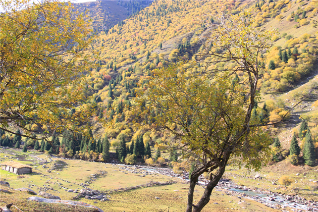 待到秋深,森林和草原渲染了浓墨重彩的色彩。白蜡、红柳、小叶榆树、白桦、野杏等红红火火的散布在漫山遍野。山谷像打翻的油彩瓶,红一块、紫一块,天空也蓝的发亮,河水里翻动着青色的光。牧人挥鞭驱赶着肥壮的羊群,唱出粗犷、豪迈的歌曲,在弯曲的山路上缓缓远去。
