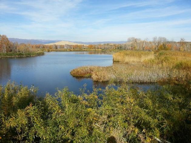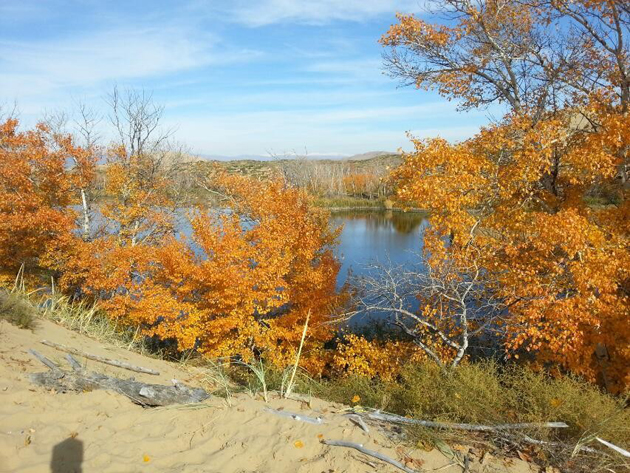 进入具有浓厚传奇色彩的中哈边境一线白沙湖边境旅游风景区。远远望去红黄树叶在风中招展,湖山映衬碧波如镜,远眺近览更是气象万千;沙地在阳光的照射下,散发出阵阵泥土的芳香,使人心醉,远处的金色鸣沙山倒映在碧绿的湖水中,湖边的各类混生林,层层叠叠,交相辉映,犹如一个完美无缺的自然大盆景,展现在游人面前。近望白沙湖,水波清潺,七彩斑斓。只见四周密布着枯黄的芦苇、菖蒲等水生植物,湖中荷花亭亭玉立,湖周边50米内,都是高大茂密的银灰杨、白杨、白桦混生的林带,秋天的白沙湖风景满眼都是美,不远处的沙丘上,白杨、山楂、野菊等植物构成一道天然屏障。 天山深处的白沙湖,宛若一位天仙少女,显得静谧而淡然,温婉而深情,湖水碧透如眸,在阳光的照射下,映衬出湖面上明亮的天空,一片湛蓝、一汪纯净。