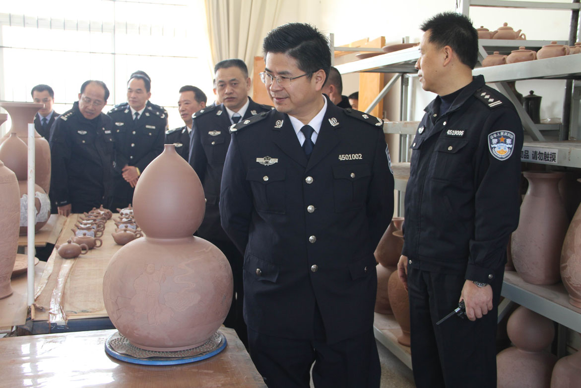 李健政委在钦州监狱监狱长龙庆云、政委文新民及相关分管领导的陪同下,进入监管区备勤楼了解执勤警察工作及劳动现场管理情况。在查看服刑人员监舍时,李健政委现场提出有关完善监舍环境的一些具体建议。随后,他还饶有兴致地参观了服刑人员坭兴陶制作、书画作品展和劳动成果展,并充分肯定钦州监狱在教育改造工作中的创新和成绩。当天,李健政委还前往钦州监狱生活区,重点走访了解小区建设规划和警察职工住房情况等。