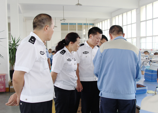 龚玲主任现场督查民警在岗履职情况,翻阅大队生产车间原材料出入登记台帐,生产工具发放原始记录,保管室储存柜钥匙掌握情况;龚主任还深入到施工工地,现场督查施工安全情况。封所长向龚主任介绍了安顺所在场所安全方面采取的一系列措施,及对进出施工人员和车辆实行的严格安全制度。