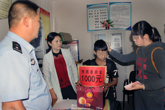 2015年9月17日,在中秋节来临之际,救助小组对特困戒毒人员张某的两个未成年子女进行救助。张某的大女儿含着泪眼说:“爸爸吸毒后,妈妈离婚走了,家里就只有弟弟和我,平时都是我照顾弟弟,两个姑妈有时间就来看看我们,给她们点生活费,我恨爸爸妈妈抛弃我们。”当救助小组民警将1000元的特困救助金和一盒中秋月饼送到张某女儿的手上时,其女儿禁不住感激之情流下眼泪。张某的妹妹也流下了感动的泪水,她表示无论多苦多累,都会照顾好两个孩子,等待张某回来,同时她请民警转告张某,告诉他要遵规守纪,好好的接受戒治,彻底戒除毒瘾,早日回来,孩子她会帮忙照顾好的,让他安心戒治。张某与妻子早就离婚,家里的两个小孩相依为命。姐姐15岁,现就读于安顺六中,弟弟11岁,就读于北关小学,姐弟俩靠两个姑妈的救济维持生活,由于父母离异,他们早就没有了“家”,平时都是在这个亲戚家住几天,那个亲戚家住几天,因为没有固定居所。救助小组之所以选择在北街居委会,对她们进行救助,一方面可以具体了解他两个小孩的情况,另一方面,可以向居委会申请对她们的相关援助。居委会工作人员向我们介绍了张某家的情况,和两个小孩现在的近况。救助小组民警也向居委会工作人员说明了对特困戒毒人员未成年子女的救助政策,同时,帮扶救助组与派出所片区民警和居委会的相关人员沟通,帮助张某的两个子女解决了医保、低保问题。