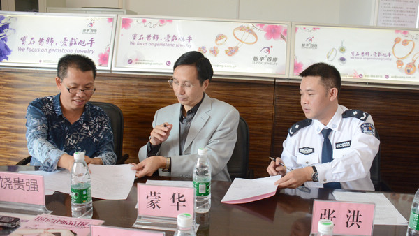 梧州市旭平首饰有限公司经理饶贵强介绍了企业及“梧州市旭平阳光之家”过渡性安置帮教基地相关情况,三方共同签订了共建“梧州市旭平阳光之家”安置帮教基地协议书。