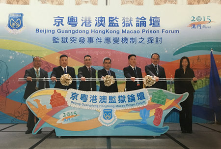 “京粤港澳监狱论坛2015”于10月14日至16日在澳门举行,来自北京、广东、香港、澳门、新加坡监狱(惩教)管理机构的代表出席了论坛。论坛由澳门保安司司长黄少泽主持开幕仪式,北京市监狱管理局林兆波局长、广东省监狱管理局陈达超副局长、中央人民政府驻澳联络办公室警务联络部宋东翔副部长、香港惩教署邱子昭署长、新加坡监狱署许荣丽参谋长,以及澳门监狱李锦昌狱长共同出席了开幕式。