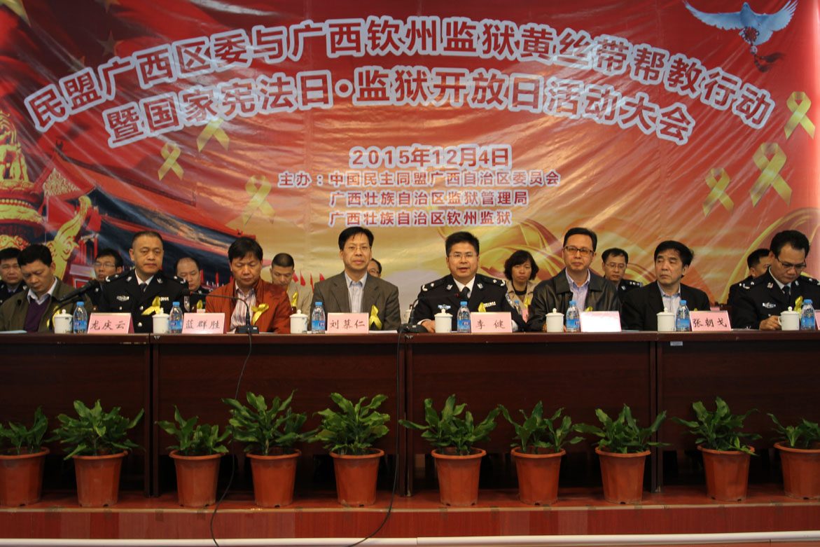 12月4日,在第二个“国家宪法日”来临之际,“民盟广西区委黄丝带帮教行动”基地在广西区钦州监狱正式启动。全国政协常委、民盟广西区委主委刘慕仁,自治区监狱管理局政委李健,民盟钦州市委副主委高著海,以及自治区监狱管理局、钦州市政法委等相关领导和钦州监狱执法监督员、服刑人员家属等共80多人共同参加了启动仪式。