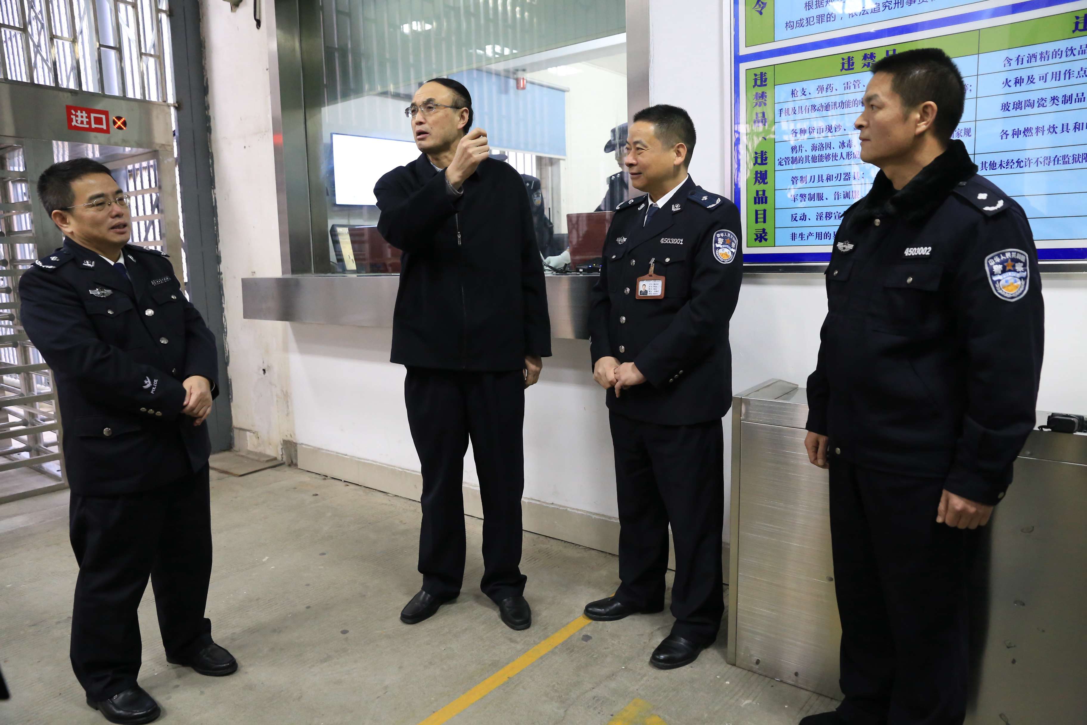 当日,李豫黔巡视员来到英山监狱监管区大门,实地观看监管区域大门进监流程以及监控、门禁等安防设备,详细了解AB门警察与武警双方值守工作安排,并来到监狱会见管理中心,深入调研监狱以显示屏滚动播出减刑政策等狱务公开做法。经过了解,他对英山监狱规范、精细的管理工作和推进“四防一体化”建设给予了充分肯定和高度评价,并结合监狱实际提出了针对性的工作要求。