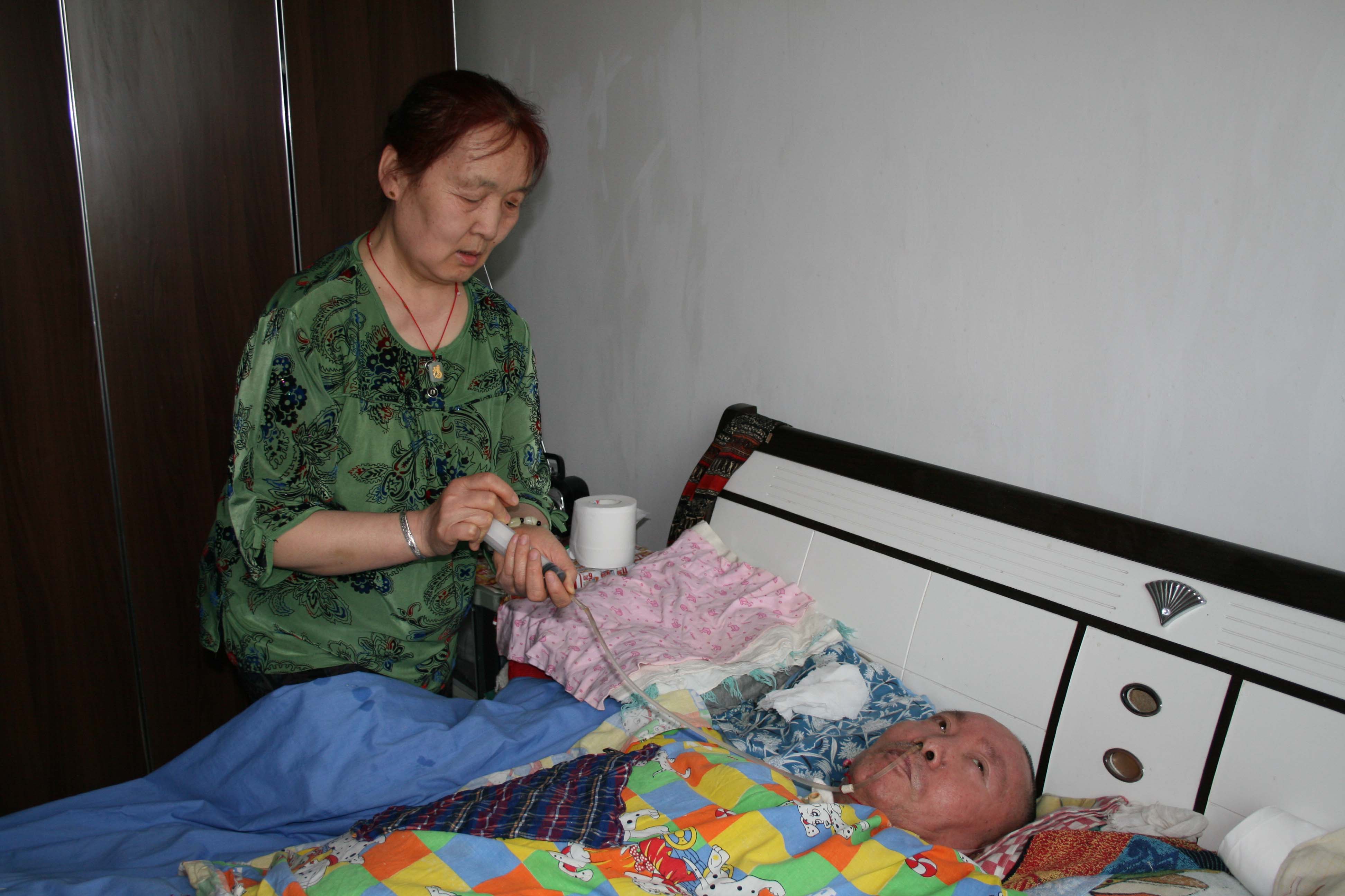 由于夜里要给老吴翻身,她也经常睡不好觉。有一次,她自己也得了重感冒,感觉全身没劲,头也痛得厉害,儿子又不在身边,这可怎么办呀?最后,她还是坚持起床,忙着给老吴准备食物,她没有任何埋怨,就这样坚持着每一天。