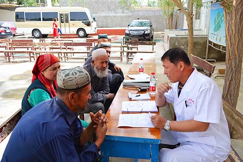 喀什监狱住村工作组:近日,喀什监狱住叶子巴格村“访惠聚”工作组,协调监狱“医疗服务队”来村开展了“送医下乡”义诊活动。