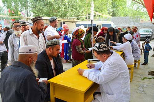 喀什监狱医院的志愿者们一到村里就开始忙碌起来,逐人登记并发放诊断单,为村民提供诊病和咨询服务。他们一边忙着给村民们诊病,一边耐心的向村民解答问题,免费给村民们做B超、测量血压及心电图等检查,还发放各类健康手册及价值7000余元的家庭常用及急救药品,并进行常见病的预防宣传。除了在现场义诊外,志愿者还深入村民家中,为个别不便出门的老人上门服务,为他们检查血压及心电图等。