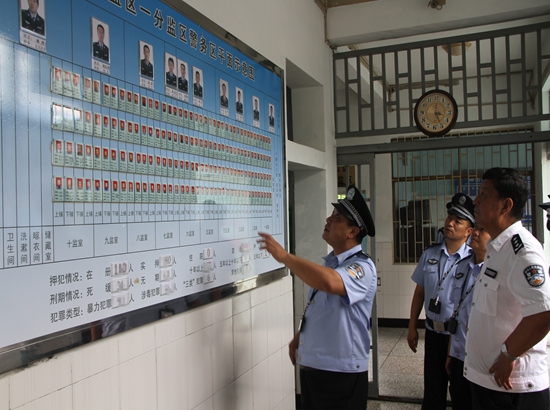 督查组一行分组深入监区一线罪犯改造三大现场,查阅资料、现场询问,对毕节监狱监管安全、生产安全、执法环境安全等方面工作开展情况进行细致检查。在禁闭室,仔细了解因违反监规纪律在此反省和接受处罚的服刑人员情况。在服刑人员生活区监舍仔细了解了执勤民警的生活工作情况,考察了监区的定置管理、零监室平移式管理、了解了“罪犯改造质量评估”工作以及警务区网格化管理。并对监狱正在开展的“我是罪犯” 、“罪行大清算”两板活动触及罪犯灵魂,积极促进罪犯改造,维护监狱安全稳定表示赞赏。督察组还对监狱AB门建设、服刑人员配餐中心、劳动改造现场以及其他监管安全设施进行了全面的检查。检查过程中何平巡视员时时不忘关心体贴基层民警,鼓励大家监狱工作是我们的职业,也是我们的事业,要全身心投入。