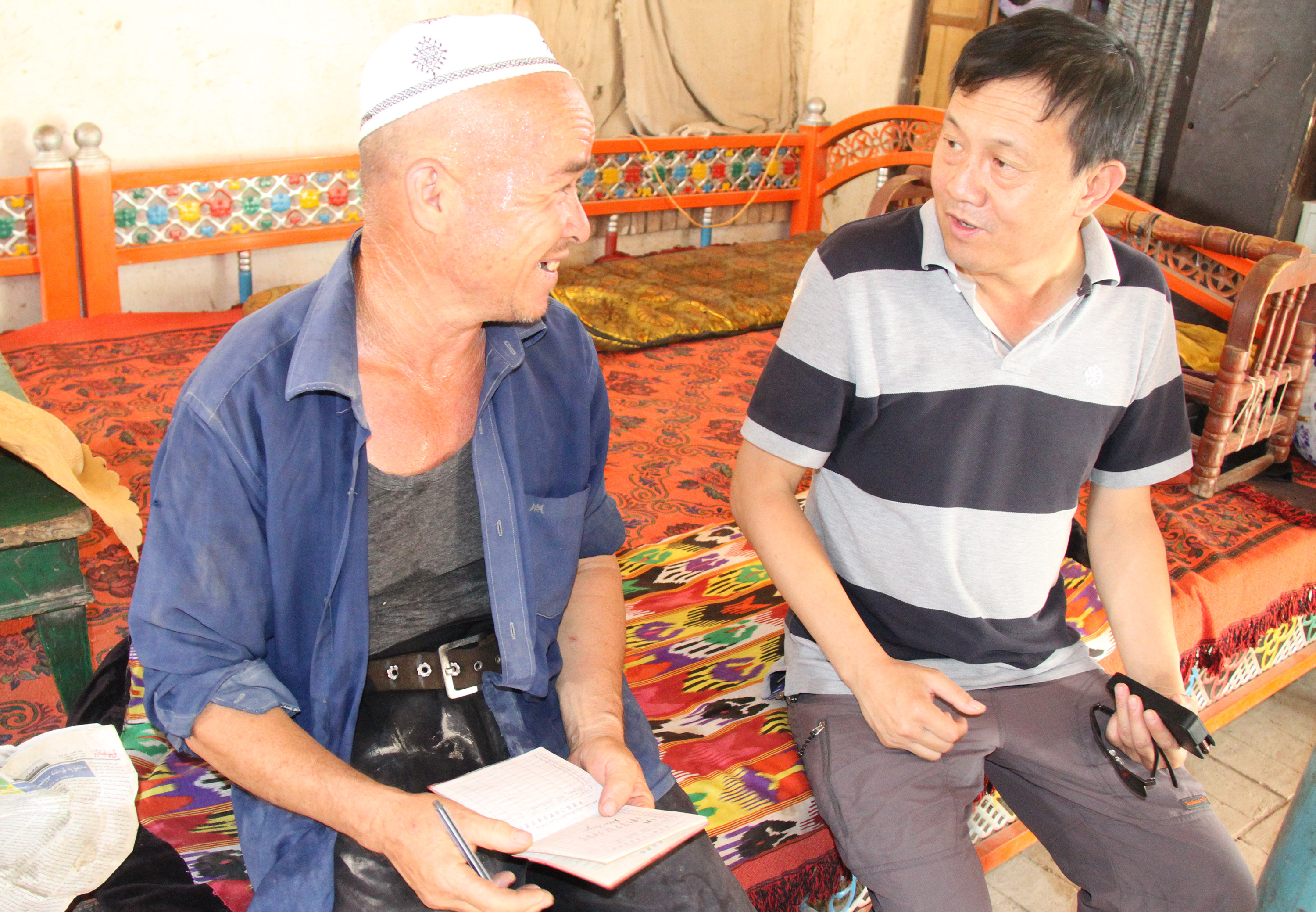 一下车,热浪迎面扑来,短短的几秒钟,便满头大汗,不一会儿,政委严为民的上衣就湿透了。但大家全然不顾,进村后,连忙找来村干部核实信息,政治处副主任阿巴百克力・吐尔逊主动当起了翻译官,大家分工明确,立即投入慰问工作,争取第一时间把党的温暖送到贫困户手中。