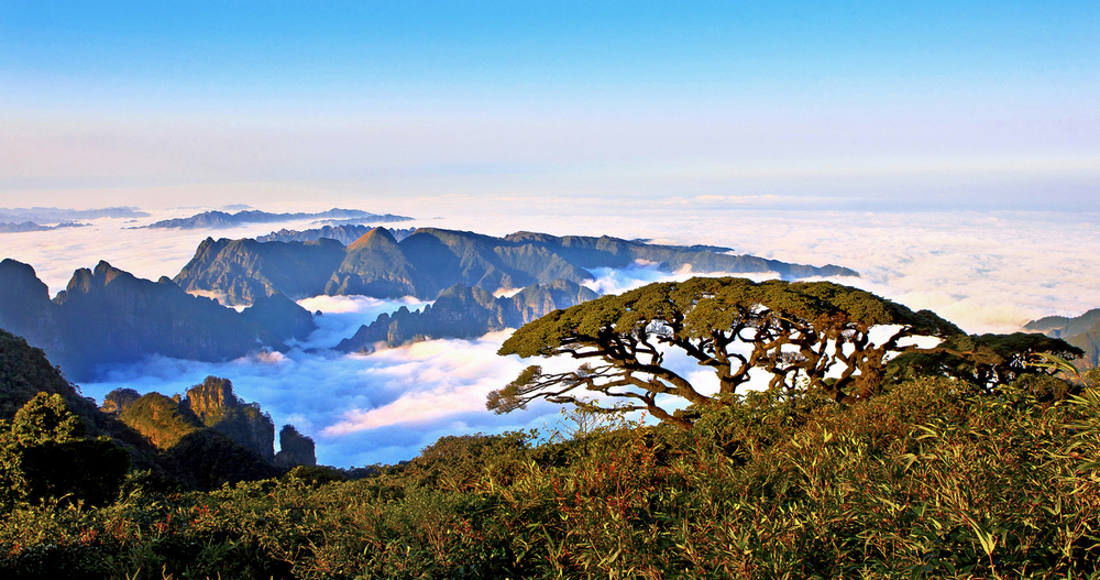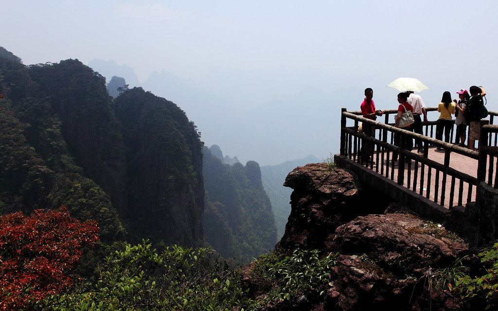 山上植有各种各样的树,银杉、南方铁杉、福建松、罗汉松、半枫荷、杜鹃等等,宛如无数婀娜多姿的美女,汇成典型的中亚热带森林风光。而最多的要数福建柏了,大都长在石头缝里,没有大树高树直破青天那种架势,却因长在石头缝里以顽强的生命力和奇特的造型而显得神奇。而万亩连片变色杜鹃亦为圣山众景一绝,每年五月是圣堂山变色杜鹃炫耀自己的鼎盛时节。万亩连片变色杜鹃同时开放,树树繁花,百花相间,花香浓郁,令人陶醉不已。更为壮观的是,在阳光照耀下,杜鹃随着花期变化而不断变化花颜,由红变紫再变白,每棵树上红、紫、白、黄竞相开放,竞相斗妍,在绿叶的衬托下就像一把把色彩斑斓的大花伞,山风吹拂,花浪翻滚,自然形成浩瀚花海,被人们誉为“人世间之桃源仙国”。遗憾的是我们去的时候错过了时间,未能欣赏这一美丽的壮观。或许人生正是因为有了遗憾才懂得珍惜吧。