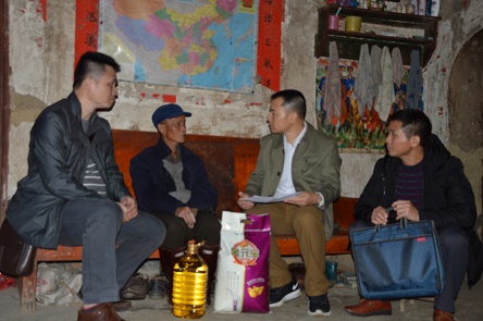 经过5个多个小时的长途跋涉,慰问组来到扶贫点。在监狱派出挂职的“第一书记”覃杨竣同志和当地村干部的带领下,慰问组分成四个小组分别奔赴山脚屯和坡泗屯,深入到27个贫困户登门认亲。“阿叔,家里情况怎么样”“身体还好吧”“家庭收入如何”……在嘘寒问暖间,慰问组实地了解了贫困户的家庭情况、收入来源、致贫原因等。据了解,中村村交通条件落后,缺资金、缺劳动力、缺技术、缺土地、因病、因残、因学等是普遍的致贫原因。慰问组慰问贫困户的同时,给他们宣传党的扶贫政策,鼓励贫困户发展劳动和生产,坚定脱贫信心。