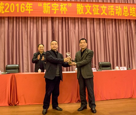 陆建武副主任宣读散文征文评比结果,有160篇文章分别获得了一、二、三等奖及优秀奖。30名散文获奖代表上台领奖,宜州监狱党委副书记、新宇总经理廖开美与桂林监狱党委副书记、政委卢有义进行了“散文杯”交接仪式,2017年由桂林监狱承办散文征文获得,命名为“英才杯”。