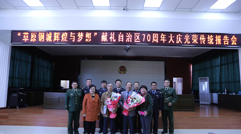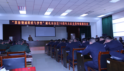 为迎接内蒙古自治区成立70周年大庆,贯彻落实全区监狱系统“队伍建设深化年”工作要求,推进“红色基因传承月”活动开展,包头监狱于4月19日上午组织举办“草原钢城辉煌与梦想”――献礼自治区70周年大庆光荣传统报告会。包头市关工委常务副主任王金陵、秘书长马彦恒应邀出席活动。监狱领导班子成员、各部门主要负责人、除值岗执勤外全体民警及40余名驻狱武警官兵参加了报告会。会议由监狱党委书记、监狱长王乾坤同志主持。包头电视台、包头立体声广播电台、《包头日报》等媒体对本次活动进行了采访和报道。