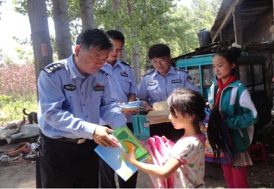 监狱党委书记、监狱长董利军为孩子们分发书包、书本和学习用品。