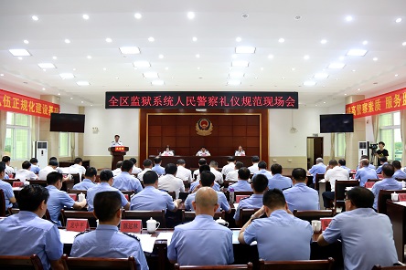 6月2日上午,广西区监狱系统人民警察礼仪规范现场会在梧州监狱召开,司法厅党委委员、监狱局党委书记、局长瞿国华;监狱局党委委员、副政委邵有才;监狱局党委委员、政治部主任赖伟容以及局机关领导、各单位政委、副政委等共计73名人员齐聚梧州,以观摩、学习为主要任务,共同见证了全区首次礼仪规范现场会的胜利召开。