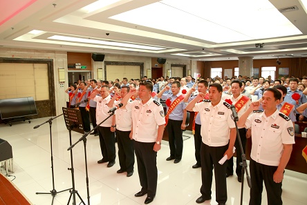 “我志愿加入中国共产党,拥护党的纲领,遵守党的章程,履行党员义务……”,自治区司法厅党委副书记、副厅长、监狱管理局党委书记、局长范军同志出席会议并领誓,全系统党员民警通过视频会议系统重温入党誓词。