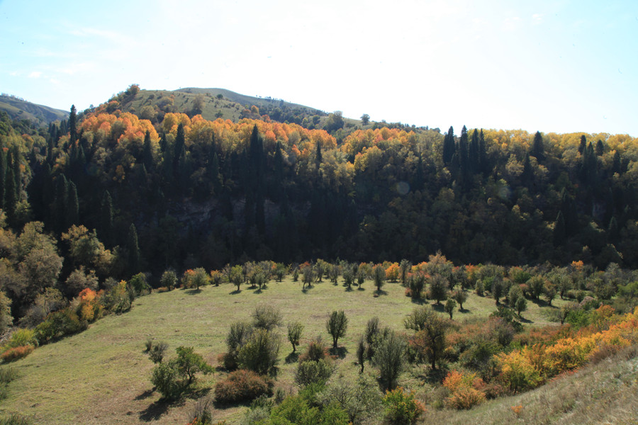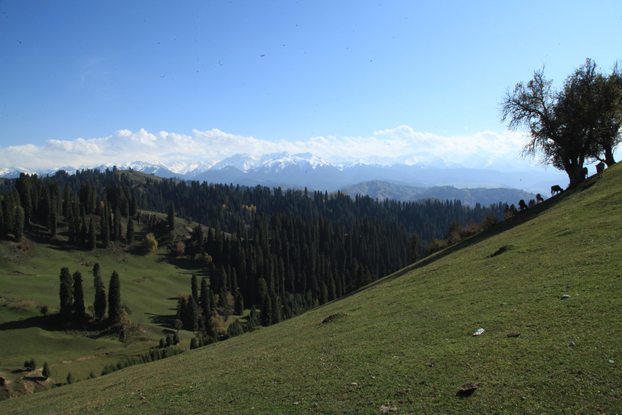 萨哈景区,山峦起伏,一山四景,绿草如茵。辽阔的草原,柔美的溪水,隽秀的群山,松林如涛的气势以及野果林的壮美尽收眼底。由于萨哈景区是原生态的自然景观,加之交通不便,除了当地牧民和部分驴友、摄友踏足外,一般无他人来到此地,所以这里也一直都保持着神秘色彩。记得有人曾说过“如果你爱一个人,带他去萨哈,那是一个存放最美心灵记忆的地方;如果你恨一个人,带他去萨哈,那是一个洗涤仇恨与欲望的地方。”萨哈,一所人间美丽的天堂,向世人展示天山深处一道宛如立体画卷般的百里画廊。