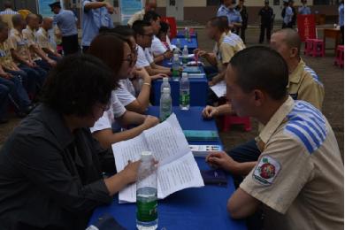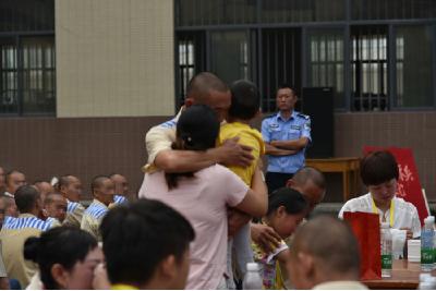 一监区服刑人员范某因贩卖毒品罪被判15年有期徒刑,因其表现良好被列学习标兵,为家人争取到了这次帮教活动的机会。高墙内,范某抱着两个年幼的孩子流下了悔恨的泪水,他告诉家人一定会积极改造,争取早日出狱,减轻妻子的负担。