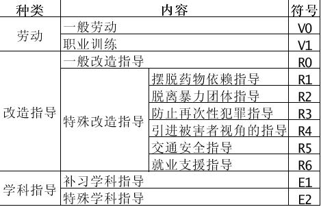 如前所述,“矫正处遇”包括“劳动”、“改造指导”与“学科指导”三大内容。其中,“改造指导”分为“一般改造指导”与“特殊改造指导”,指的是让罪犯掌握适应社会生活所必要的知识和生活态度,提高罪犯的责任感与自觉意识,培养健康的身心。一般改造指导是通过谈话、体育、仪式活动、面谈、咨询等方式,让罪犯理解被害人的情感,体验罪恶感;培养规律的生活习惯与健全的思考方式,增进身心健康;做好回归社会的心理准备,掌握适应社会的必需技能。特殊改造指导指的是对于因药物依赖等因素而难以顺利改造并回归社会的罪犯,进行有助于摒除这些因素的特殊指导。特殊改造指导包括摆脱药物依赖指导、脱离暴力团体指导、防止再次性犯罪指导、引进被害者视角的指导、交通安全指导及就业支援指导等六个类型。