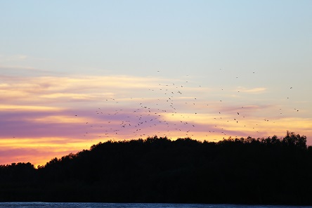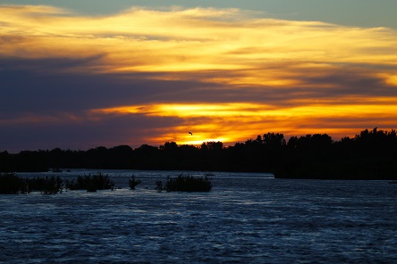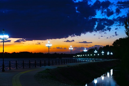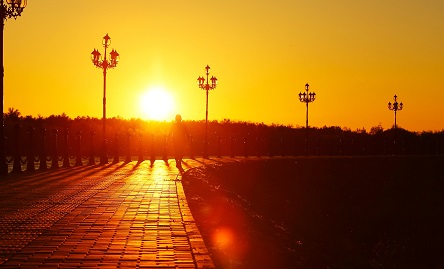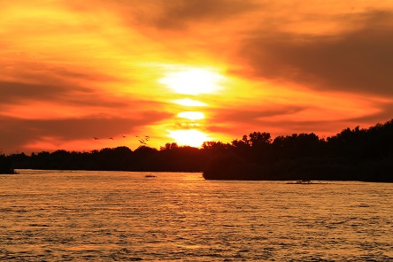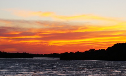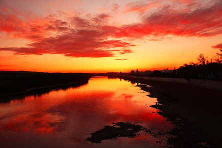 摄影虽然是光与影的艺术,但有个好运气也是必不可少的,六月天的傍晚,我拿着相机在河边散步,忽然觉得被轮罩在一种绮丽的景色之中,只见太阳还露半个身体,阳光照射在脸部暖洋洋的。渐渐地,太阳落下,发出道道金光,让天空变成大红色,不时有一群大雁飞过。再过一会,便成了黄色,一道道黄色的云彩好似地埂高低起伏,时而像山峦、时而像茶梯,美极了。这时飞过一只雄鹰,到对面小岛上,紧接着便是成百上千的雄鹰起飞。接着,太阳剩下一点点,还发出最后一道耀眼的红光,直接将黄色换成中国红,把整个天空染得红彤彤的,犹如一只神奇的巨手,将黄色的幕布换成火红,火红下的河堤便是老者悠闲垂钓之处。之后,太阳便消失在地平线上,留下一抹黄色,衬托着蔚蓝的天空,将白云勾勒成蓝色。两个小时地换装,一会黄,一会红,一会半黄半紫,一会半灰半红,真是色彩缤纷,变换无穷。其实晚霞不只是有着最迷人的颜色,它带来的更是第二天的大晴,必定俗语曰:朝霞不出门、晚霞行千里嘛。