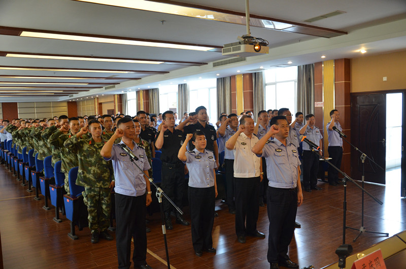 党委委员、副所长曾军利带领参会人员宣誓:“紧密团结在以习近平同志为核心的党中央周围,进一步增强“四个意识”,坚定信念、牢记使命,忠于职守、敢于担当,全力以赴确保安全稳定,以优异的成绩迎接党的十九大胜利召开。”誓言响彻整个会议室,掷地有声的誓言、执着坚定的目光展现着未管所民警的良好精神风貌,通过誓师大会进一步凝聚全所民警保稳定、促安全,护航十九大的信心和决心。