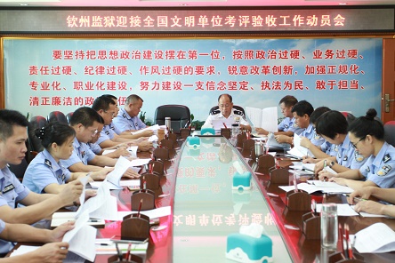 近日,钦州监狱紧急召开迎接全国文明单位考评验收工作动员会,迅速传达8月18日在南宁召开的全区监狱系统创建全国文明单位工作部署会精神,明确要求各责任部门务必抓紧时间,顶住压力,完善各项创建指标任务的收尾工作,并协调组织好各项迎检准备工作,以积极姿态和良好面貌迎接即将于8月底开展的文明创建考评验收。