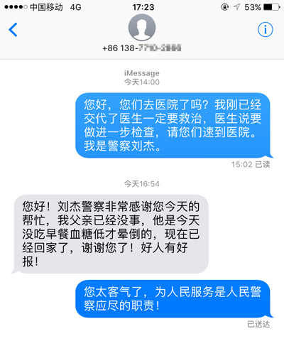 大约三分钟后,刘杰同志派出所两名辅警同志来到公交车,并搀扶着老人下了公交车,下车的同时,刘杰向路边的商铺大声喊道:“车上老人晕倒了,请大家帮忙搬条凳子来。”在刘杰的感召下,周围的群众纷纷加入爱心帮助中,有的找来了凳子,有的送来了饮用水,有的拿来了毛巾,有的拿着扇子帮老人扇风……大家合力扶着老人坐在凳子上,着急地等待着救护车的到来。