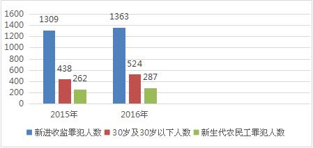 根据笔者对广西某监狱2015――2016年相关数据的统计,得出如下两个图表。该监狱2015年新生代农民工罪犯占总新收监人数的20%;2016年新生代农民工罪犯占总新收监人数的21%。