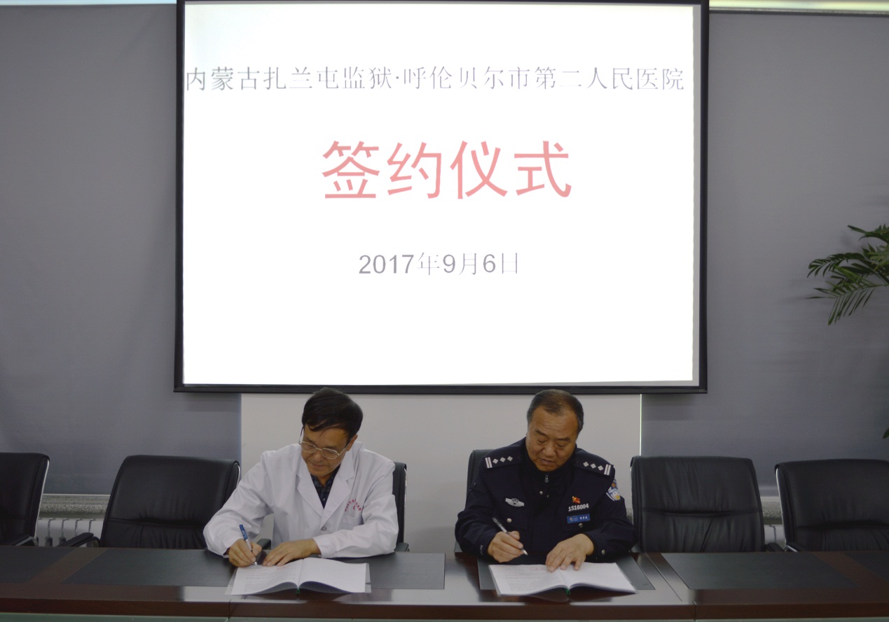 为进一步加强扎兰屯监狱传染病防治工作,提升监狱医疗卫生工作水平。9月6日,扎兰屯监狱党委委员、副监狱长崔多君与呼伦贝尔市第二人民医院杨全胜副院长在《扎兰屯监狱与呼伦贝尔市第二人民医院医疗协作协议书》上签字,这也标志着两家单位正式建立医疗合作关系。扎兰屯监狱医院、生活卫生科等部门负责人以及呼伦贝尔市第二人民医院办公室、医务科等相关科室负责人参加了签字仪式。