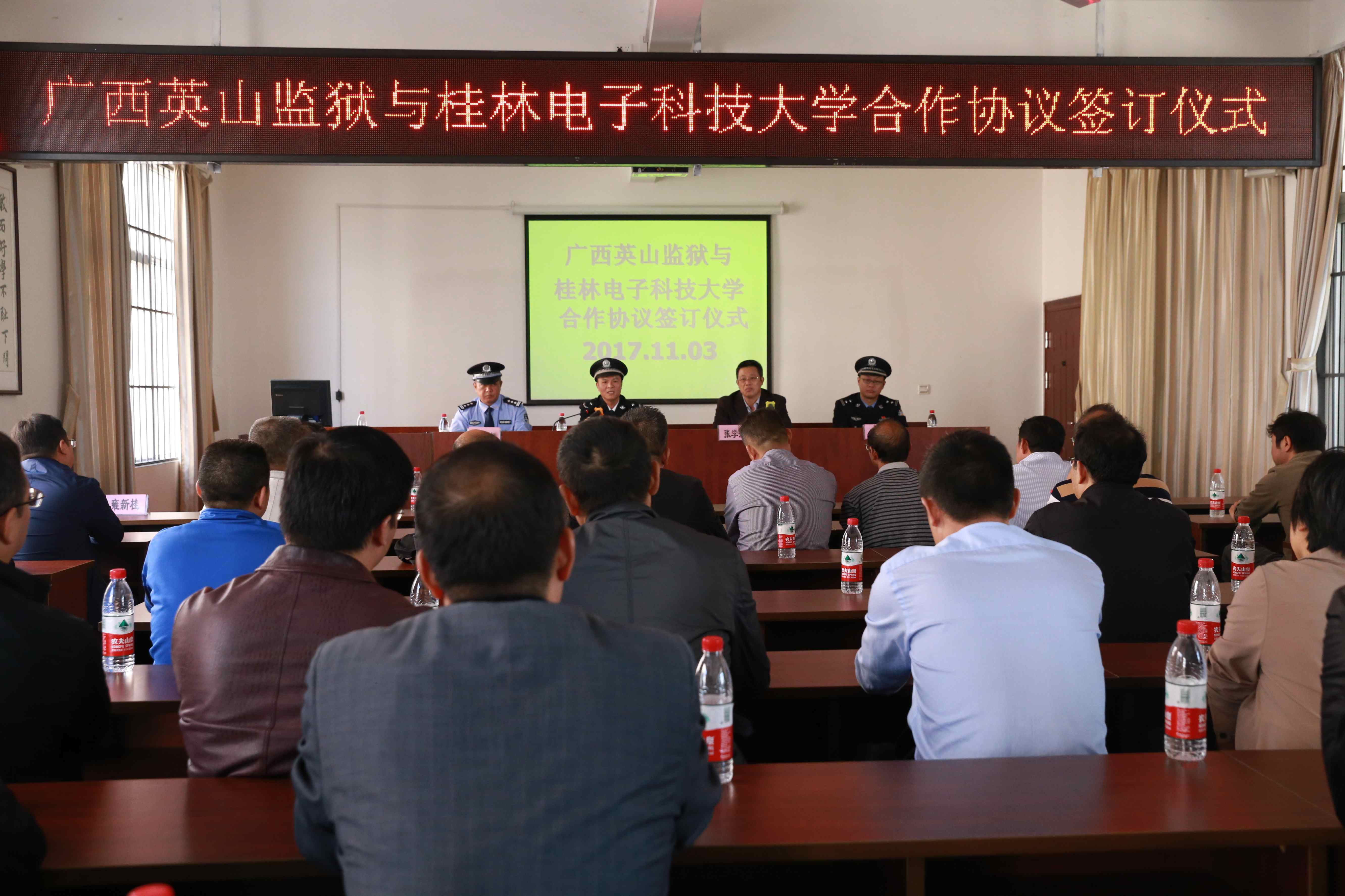 在双方代表的共同见证下,黄学平监狱长和张学洪书记为“桂林电子科技大学警示教育基地”揭牌,并签订了《广西英山监狱 桂林电子科技大学合作协议》,推动双方的良好合作。协议约定,双方以艺术进监、文化进监、开展警示教育、法制教育出监进校等方式进行合作。合作协议的签订,标志着英山监狱教育改造社会一体化工作,尤其是推动社会资源参与教育改造工作方面又取得重要进展。双方合作的启动,必将会进一步推动学分制的落实,提高监狱教育改造工作的社会化水平,更好的贯彻落实治本安全观。