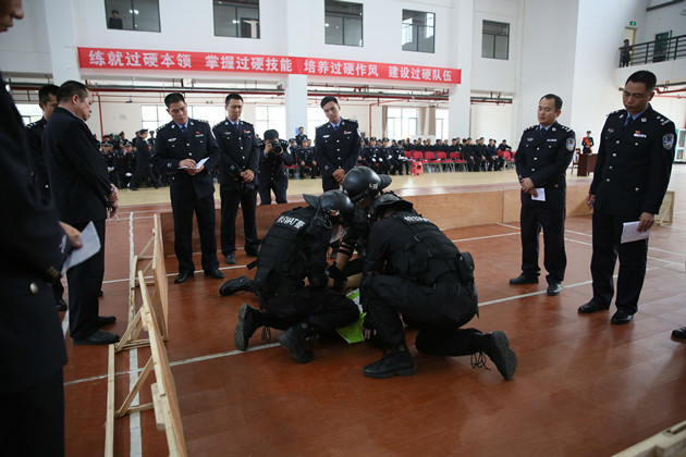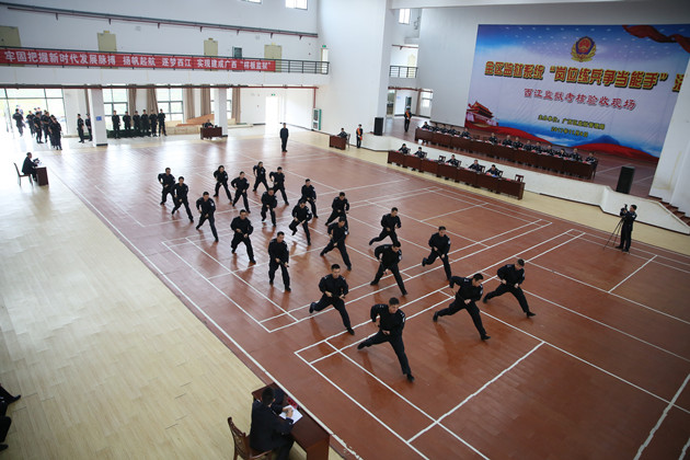 在集体项目中被抽到的单位先后演练了队列、警棍盾牌操、擒敌拳、低伤害战术、警棍操、遇抗控制术等项目。广西西江监狱的参检警察精神抖擞、动作规范、排面整齐、口号震天赢得了观众的阵阵掌声,以良好的精神面貌展现了练兵成效。在抽检队列指挥、队前讲评、政治理论、岗位业务知识、“四知道”等个人项目中,被抽到警察以熟悉的理论知识、过硬的业务技能、扎实的警体基本功沉着应战接受考核。同时,考核组对监狱及被抽检的三个党支部的“岗位练兵 争当能手”活动材料进行了查验。考核验收现场秩序井然,考官严肃认真,被抽检的单位及个人沉着应战、积极配合考核验收工作。
