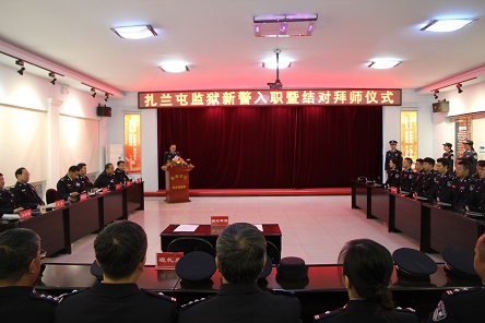 仪式上,政治处副主任高明圆带领24名新警进行了庄严的入警宣誓。党委书记、监狱长曹学泉,党委委员、副监狱长田强为新警颁发了入职纪念品。吕德泽、张海宏分别代表新老民警做了表态发言,并签订了结对拜师状。随后,党委书记、监狱长曹学泉做讲话。他首先代表监狱党委对24名新警同志表示了热烈的欢迎。他指出,现在正是扎兰屯监狱处于跨越式发展的关键阶段,正是全区监狱系统“两年打基础、三年上台阶、五年进前列”的关键时期,他为大家能够处在这样好的干事创业环境里感到高兴。他希望,全体新警同志一是要爱岗敬业,把职责牢记心间。不忘初心、牢记使命、忠诚履职,自觉把思想和行动统一到厅局党委与监狱党委的要求上来,全力以赴确保工作要求落实到位。今后,能够在新的工作岗位上,努力实现自我价值,成就一番事业。二是能堪当表率,把要求落在实处。加强学习,及时更新观念。不断提高自我,自动自发做好本职工作,身上不仅要有朝气,更要有闯劲儿,面对困难,要敢于勇往直前。要对上级的指示和下达的任务要认识到位,理解透彻,要养成雷厉风行的工作作风,要争当先锋模范,争做排头兵。三是愿踏实肯干,创未来勇挑重担。新警同志刚刚参加监狱工作,要学习和掌握的东西还有很多,希望大家要静下心来,俯下身子,向书本学、向同事学、向老民警学,踏实工作,要把工作视为一项事业去不懈追求。他表示,新警同志是未来、是希望,要进一步增强责任感和使命感,做一名“忠诚、干净、担当”的监狱人民警察,在扎兰屯监狱事业发展的实践中贡献自己的青春、智慧和力量,在打造北疆靓丽风景线的伟大征途中划上你们浓墨重彩的一笔!