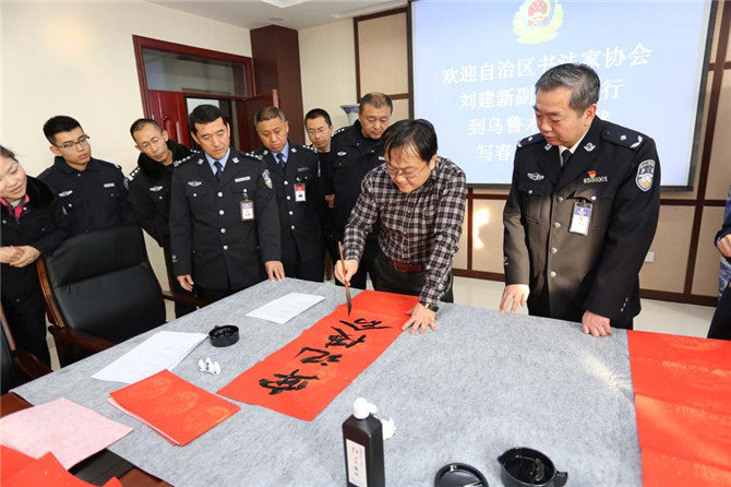 2月1日,自治区书法家协会副主席刘建新带领自治区书法协会书法家来到乌鲁木齐监狱现场挥毫书写对联,不仅给民警职工带来浓浓的祝福,也让大家享受了一场书法艺术的盛宴。
