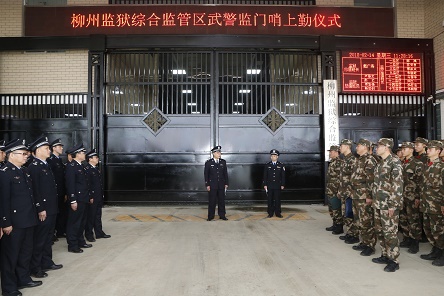 2月14日上午11时16分,柳州监狱、武警柳州支队联合举行了柳州监狱综合监管区武警监门哨上勤仪式。柳州监狱党委书记、监狱长戴广寿、党委副书记、政委黎长木、党委副书记、公司总经理蒋富有、党委委员、副监狱长刘剑、李斯育、武警柳州支队副支队长李一锋、监狱机关科室相关领导、综合监管区各监区领导和九监区部分警察代表、武警柳州支队执勤三大队大队长肖家贵、教导员刘旭峰以及担负监门哨上勤任务的武警柳州支队执勤三大队九中队全体武警官兵90多人参加了仪式。