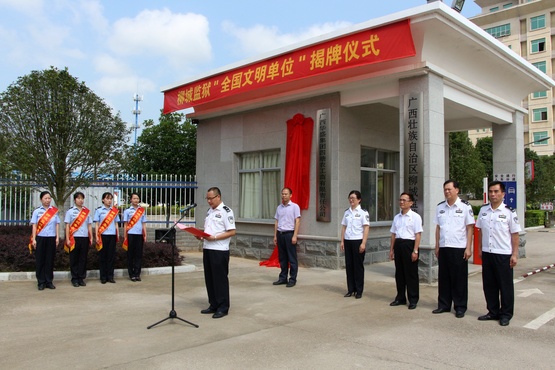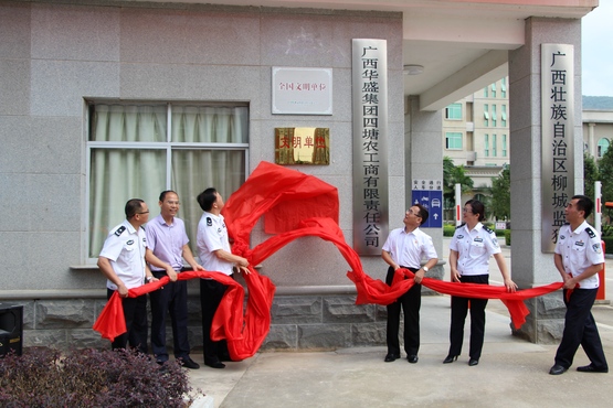 揭牌仪式上,自治区直属机关文明办主任颜东伟,自治区监狱管理局党委委员、副政委赖伟容,柳城监狱党委书记、监狱长覃洲,柳城监狱党委副书记、政委梁金才,柳城监狱党委副书记、公司总经理蔡剑辉,柳城县县委常委、宣传部部长、副县长郭建鹏共同为荣获第五届“全国文明单位”的柳城监狱揭牌。它标志着柳城监狱在文明创建工作上迈上了新台阶,实现了新突破。